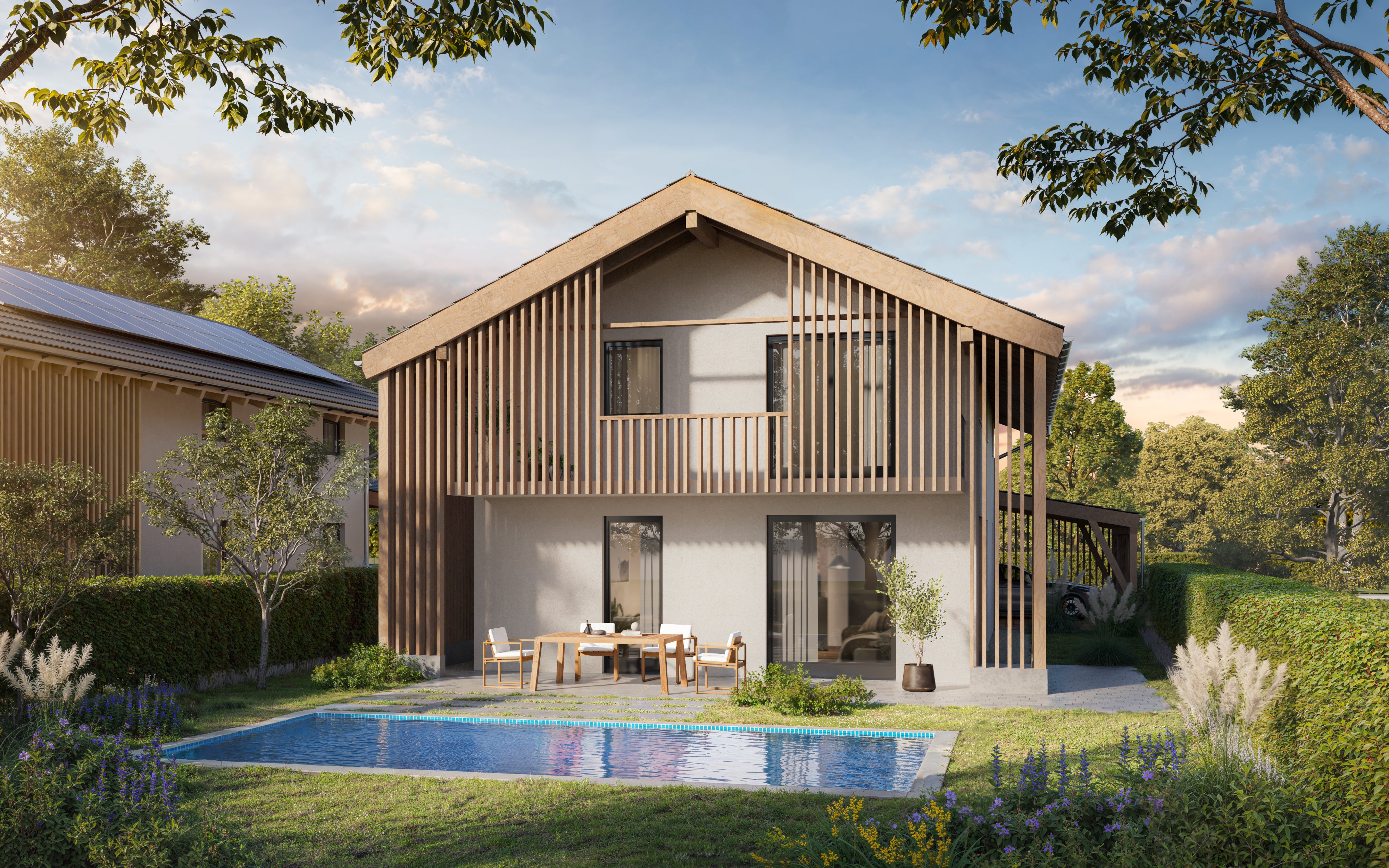 Yes. We model the house, basic topography/driveway, and context planting. Detailed landscape design, specific plant species, or large-area site work can be added as options.